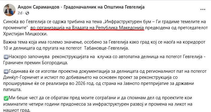 Градоначалникот на Гевгелија Сарамандов објави дека учествувал на владина трибина во Гевгелија, по што Владата експресно го демантираше Сарамандов и појасни дека се работи за партиски трибина.